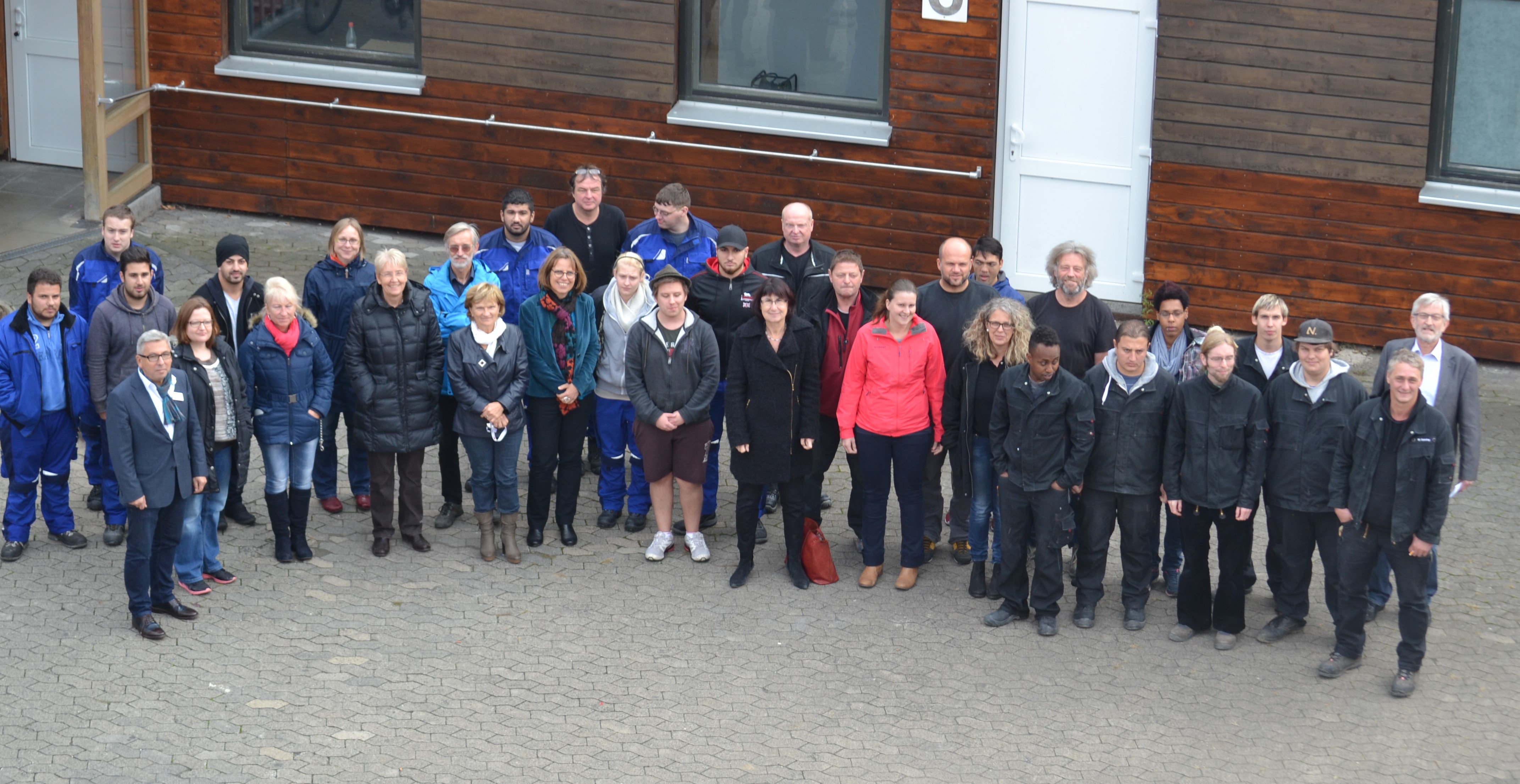 Vertreterinnen und Vertreter der Institutionen, die zur Förderung der Ausbildung beitragen, begrüßten die neuen Auszubildenden in der Jugendwerkstatt. (Das Foto zeigt die neuen Auszubildenden zusammen mit Gerda-Weigel-Greilich, Bürgermeisterin der Stadt Gießen, Astrid Eibelshäuser, Schuldezernentin der Stadt Gießen u.a.)