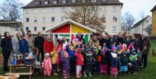 Mit lauten Jubelrufen stürmten die Kinder der Caritas Kindertagesstätte Edith Stein das kunterbunte Wetterschutzhäuschen, das zukünftig das Freispiel der Kinder im Außengelände um eine weitere Spielmöglichkeit bereichert.