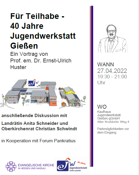 Am 27.04.2022 begrüßen wir im Rahmen unseres 40-jährigen Jubiläums in der Veranstaltungsreihe Forum Pankratius Prof. em. Dr. Ernst-Ulrich Huster mit einem Vortrag über Für Teilhabe – 40 Jahre Jugendwerkstatt Gießen.