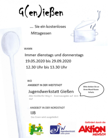 G(en)ießenDie Jugendwerkstatt bietet dienstags und donnerstags zwischen 12.30h und 13.30h ein kostenloses Mittagessen für die Weststadt an. Die to-go-Essensausgabe findet auf dem Hof statt. Dabei muss ein Mund-Nasen-Schutz getragen werden. |