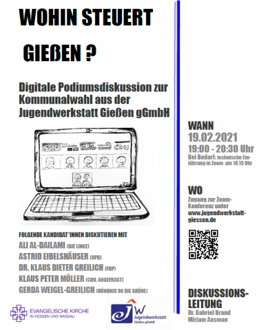Podiumsdiskussion aus der Jugendwerkstatt: Wohin steuert Gießen?Am Abend des 19.02.2021 trafen im digitalen Raum über sechzig Menschen aufeinander. Mit einer Schweigeminute für die Opfer des rassistischen Anschlags vom 19.02.2020, die Dekan Witte-Karp einleitete, begann die Podiumsdiskussion zum Thema "Wohin steuert Gießen?". Es diskutierten: |