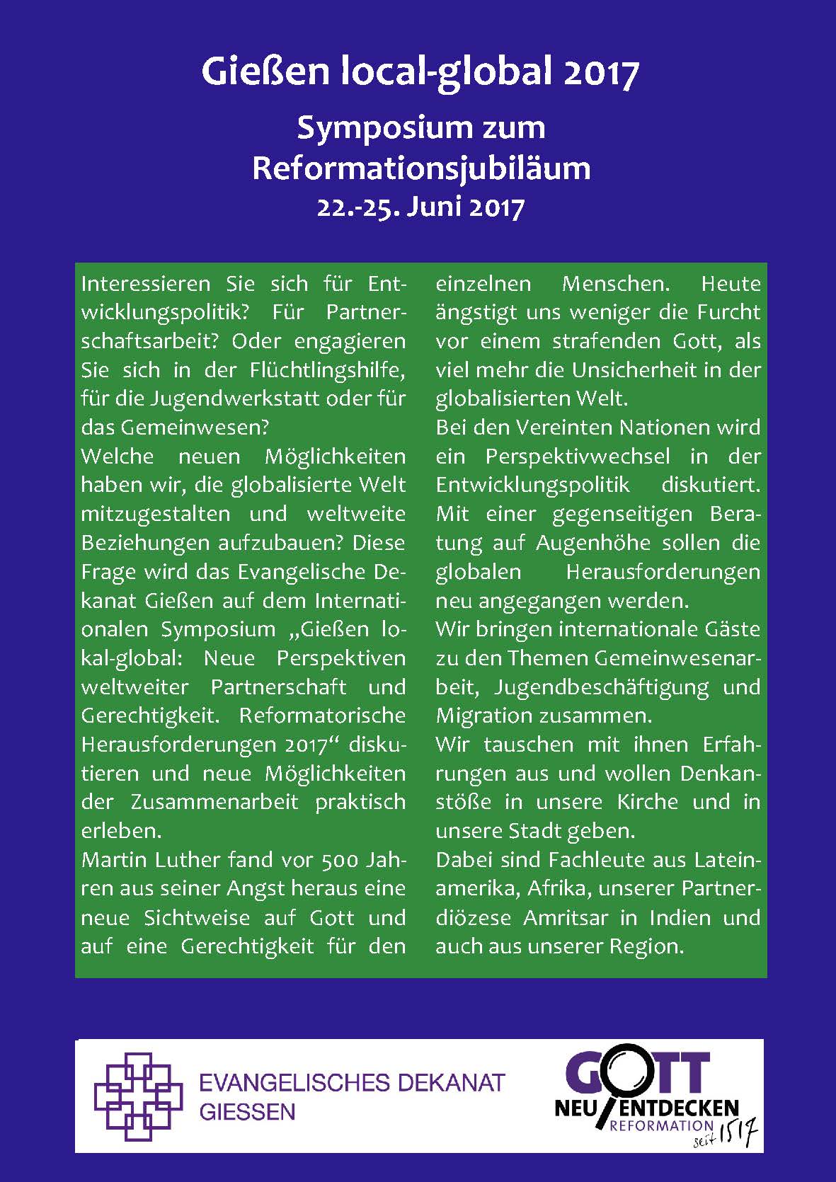Zum Reformationsjubiläum 2017 organisiert das Evangelische Dekanat Gießen vom 22.-25. Juni 2017 ein Symposium "Gießen local-global" mit internationalen Gästen zu den Themen der Agenda 2030.