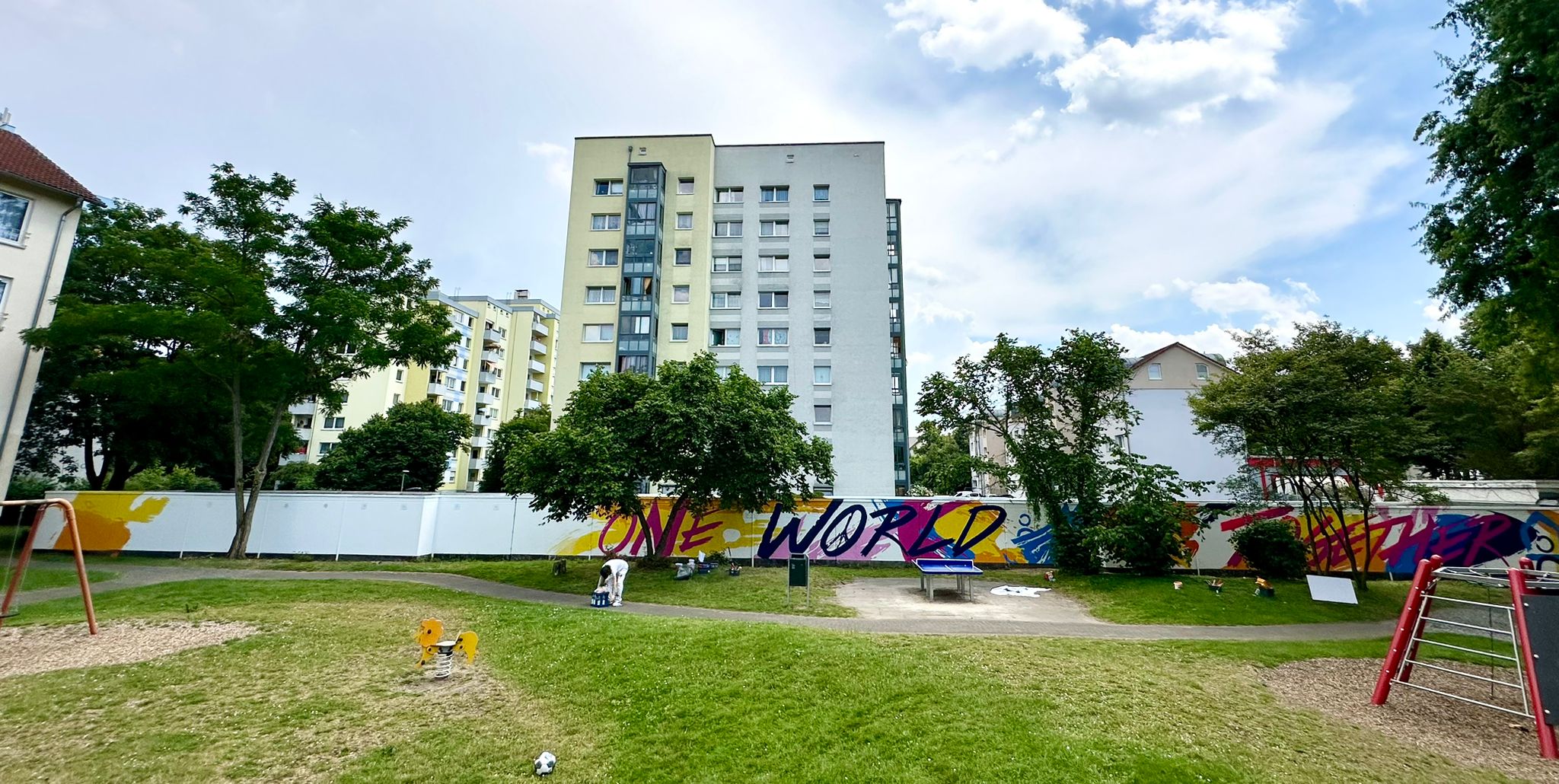 In der Hardtallee wurden Garagenrückwände mit einer Fläche von ca. 100 Quadratmetern bemalt und besprüht. Das Motiv wurde vom Künstler entworfen, die Jugendlichen brachten eigene Ideen ein. Unter dem Motto „One World – Together“ lernten die Jugendlichen wie ein Graffity entsteht und Schritt für Schritt umgesetzt wird.
