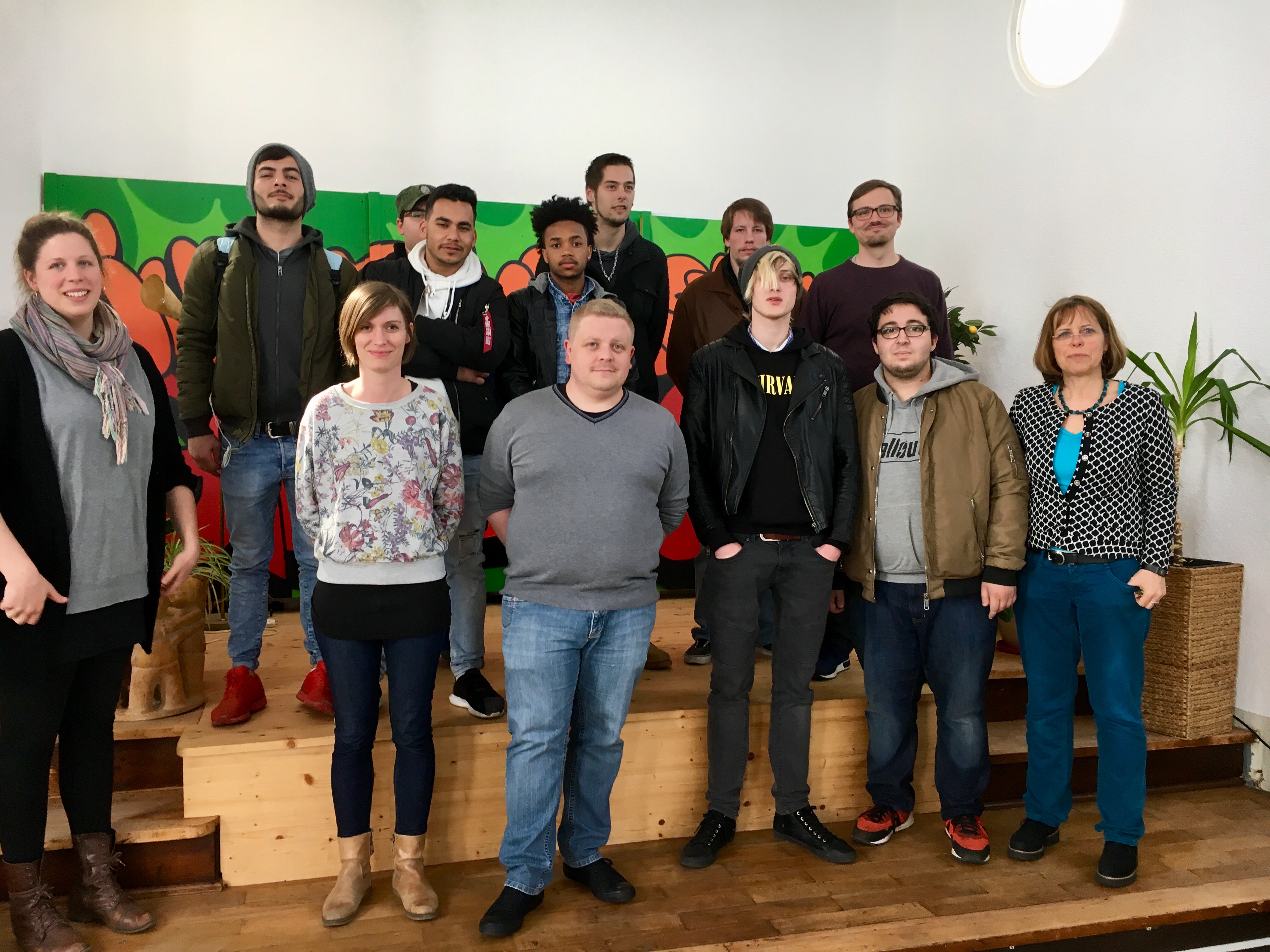 Das Bild zeigt Teilnehmer des Demokratie-Workshops „Das WIR macht den Unterschied“ mit Matthias Blöser (hintere Reihe 1. v.re.) in der Werkstattkirche der Jugendwerkstatt Gießen