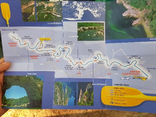 Am darauf folgenden Freitag machten wir uns auf den Weg zum Campingplatz (Camping des Gorges) nach Saint-Martin-d‘Árdéche,  das hieß wieder die Zelte aufbauen. Am Samstag gingen ein paar von uns wandern, andere blieben im Camp und ruhten sich mit langem Schlafen oder am Pool aus. Am Sonntag, den 8.September, fuhren wir die d'Árdéche mit kurvigem Verlauf, zahlreichen Stromschnellen und Felswänden, 32 km Strom abwärts entlang. Ein paar von uns hat sie zum Kentern gebracht. Die Fahrt ging gegen 9:00 Uhr morgens los und gegen 17 Uhr kamen wir wieder im Camp an. Gutes Teamwork und gegenseitiges Vertrauen sind schon notwendig. Am nächsten Tag sind wir alle in die  „Grotte de La Madeleine“  gefahren, die Grotte ist 65 m tief. Die Grotte hat ein kleines Museum, wo man den Verlauf der d'Árdéche sehen kann.