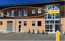 Die Mädchen*werkstatt findet man im Gebäude 4 (orangenes Haus) im 1. Stock auf der linken Seite (siehe Bild).