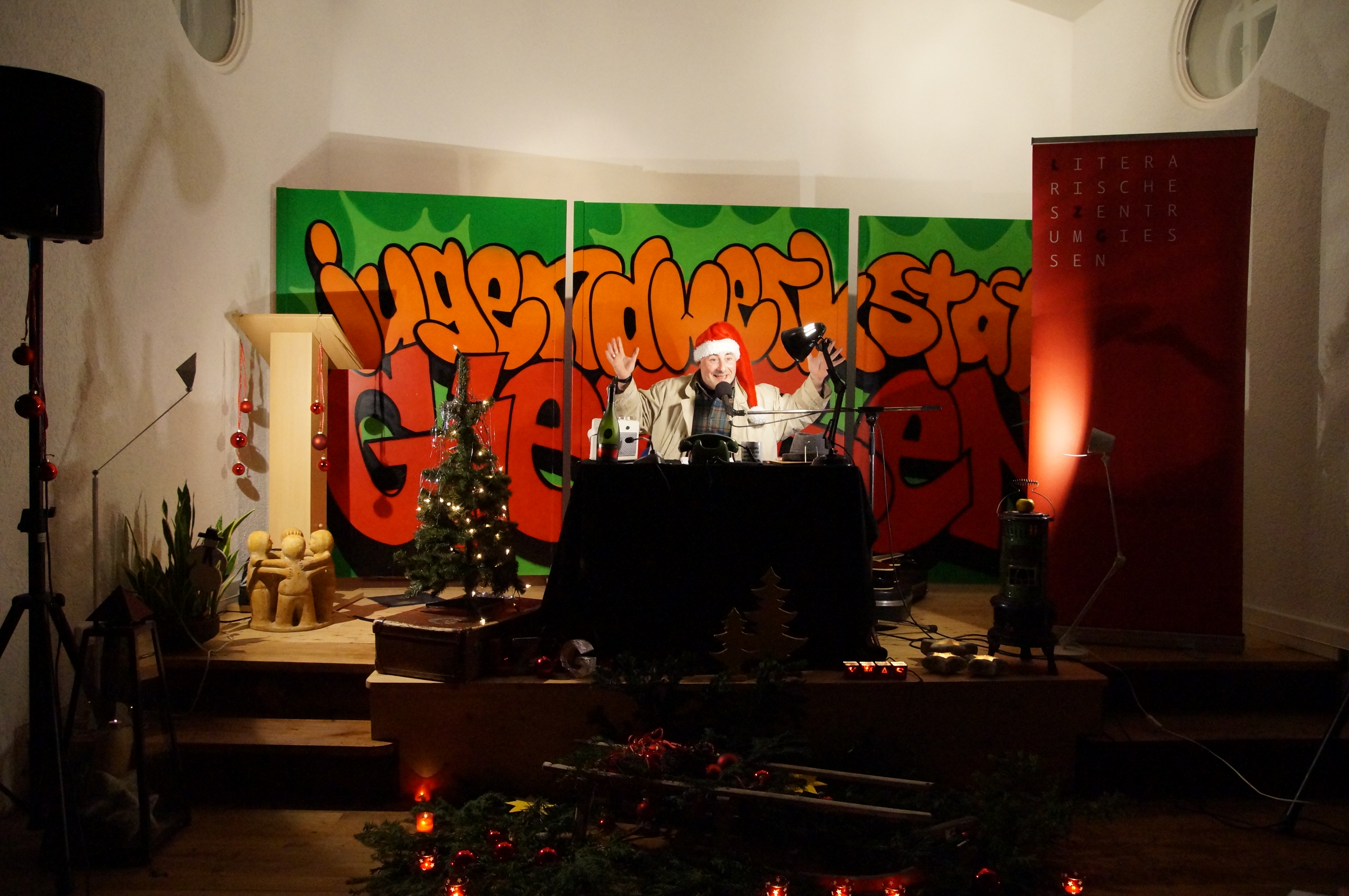 …hieß es am 5.12. in den Räumen der Werkstattkirche in der Ederstraße. Autor, Schauspieler und Musiker Sascha Gutzeit präsentierte eine unvergleichliche Mischung aus Live-Hörspiel, Lesung und Musik-Kabarett. Die Veranstaltung wurde vom Literarischen Zentrum Gießen organisiert.