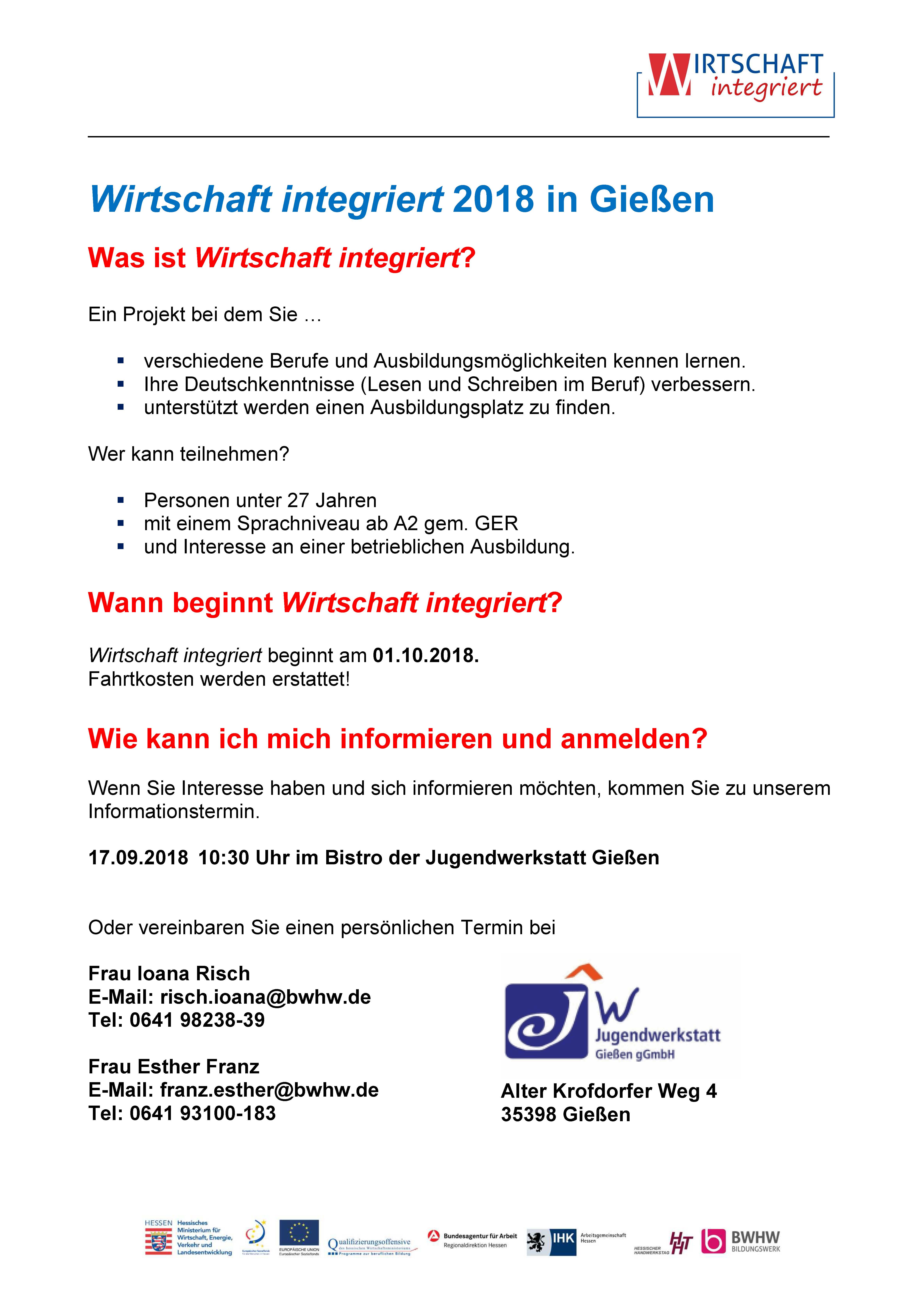 Infotermin am 17. September 2018, ab 10:30 Uhr im Bistro der Jugendwerkstatt, Alter Krofdorfer Weg 4, Gießen