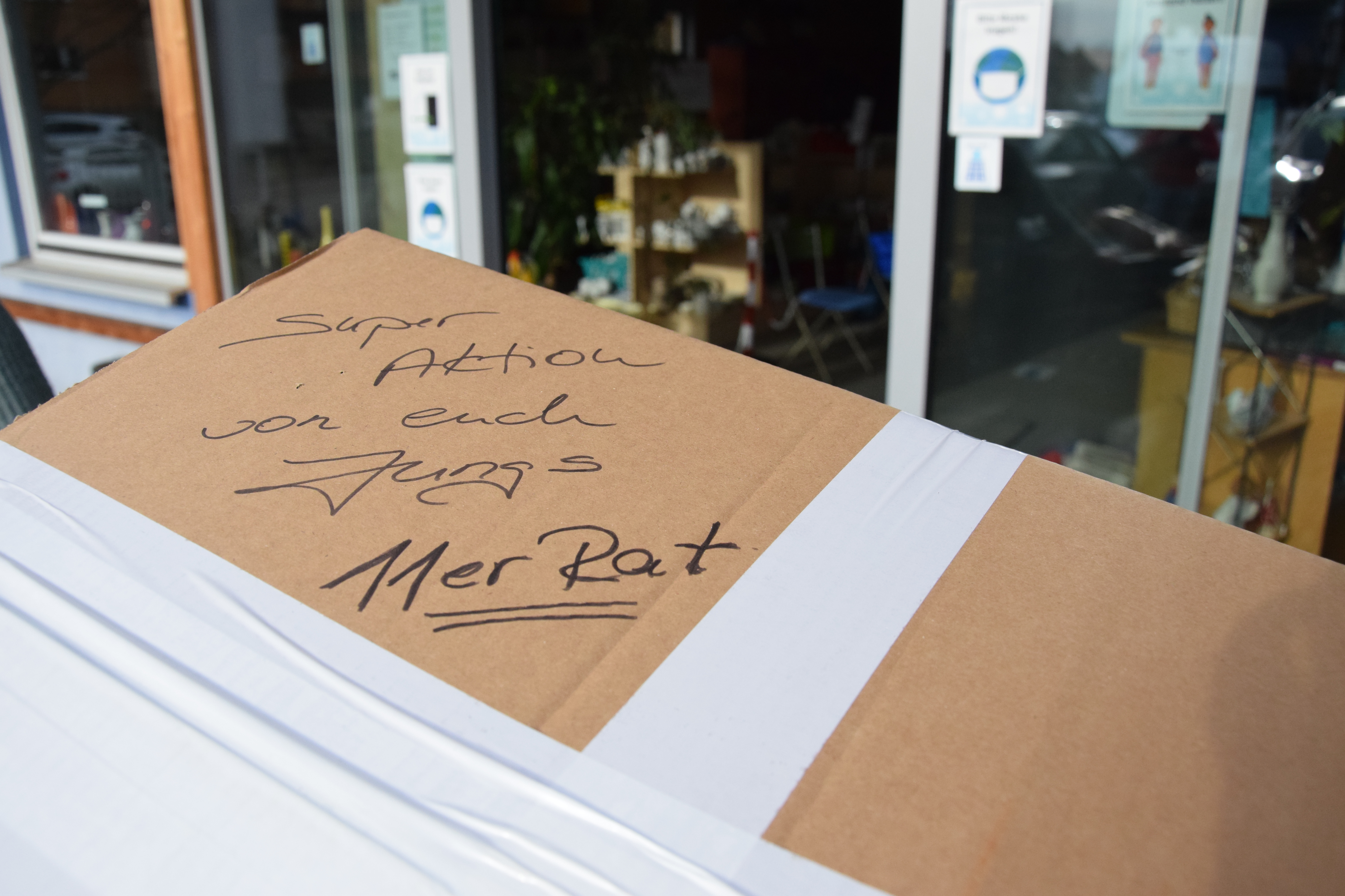 Das Team des KAUFHAUS zeigte sich sichtlich begeistert über die Hilfsbereitschaft und schloss sich der Aufschrift auf einem Spendenkarton an: „Super Aktion von euch Jungs!“