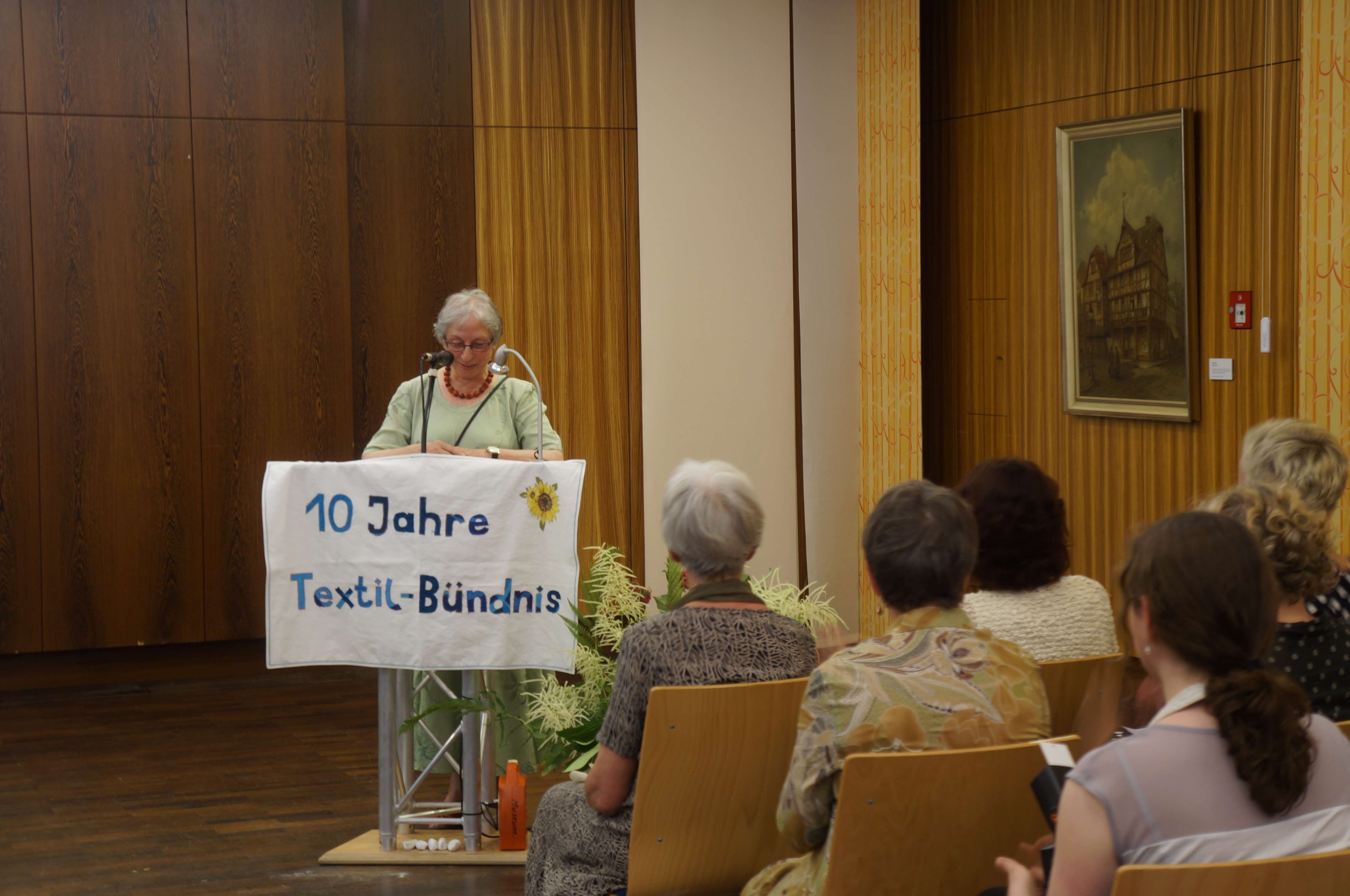 Das Jubiläum des Textilbündnisses, welches neben dem Betreib des gemeinnützigen Secondhandladnes auch politisch aktiv ist, war ein Festakt mit Politprominennz. Zu den Festrednerinnen gehörten neben Ilse Staude vom Gießener Weltladen und Anne Nibbenhagen von romero die Gießener Oberbürgermeisterin Grabe-Bolz und Heidemarie Wieczorek-Zeul, Ministerin für wirtschaftliche Zusammenarbeit und Entwicklung a.D., die in ihrem Redebeitrag den Kampf um bessere Arbeitsbedingungen in der Produktionsländern unserer Textilien aufgriff. Die sozialen Aspekte der Textilproduktion, aber auch die ökologischen Zusammenhänge sind es, die dem Textilbündnis Gießen besonders am Herzen liegen.