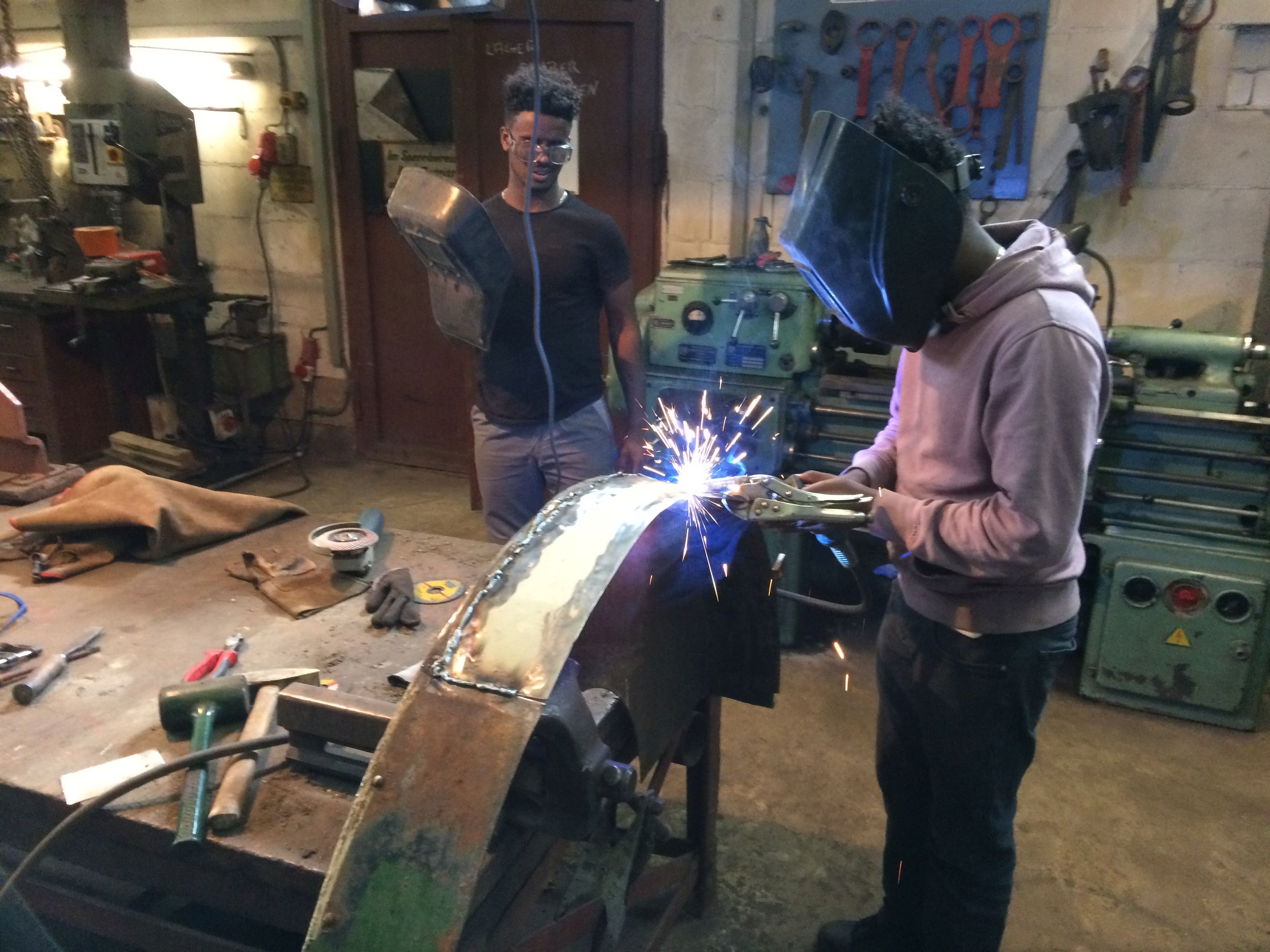 Seit einigen Monaten besuchen wir drei das Bergwerk ein bis zwei Mal in der Woche. Wir helfen dort, alte Geräte wie zum Beispiel Züge zu reparieren. Zu unseren Aufgaben zählt Schleifen, Schweißen, Lackieren, Malen und auch Bohren. Diese Dinge haben wir in der Jugendwerkstatt gelernt, aber manche von uns haben auch früher in ihrer Heimat schon Erfahrungen damit gesammelt.