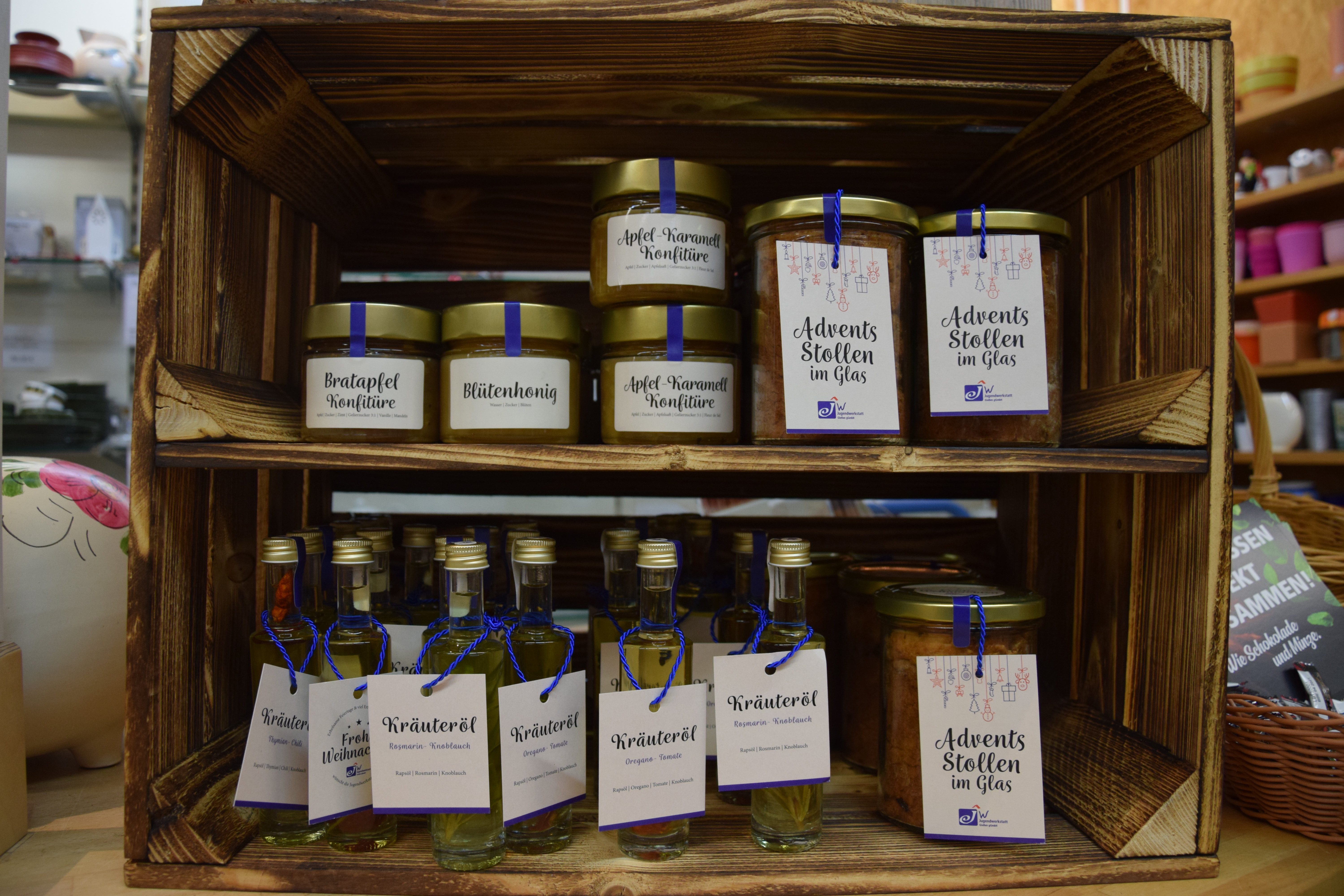 Die Abteilungen der Jugendwerkstatt Gießen gGmbH stellen im gesamten Jahr verschiedene Produkte her, die dauerhaft im Kaufhaus erworben werden können. Seit dieser Woche gibt es darüber hinaus die speziellen Weihnachtsprodukte.
