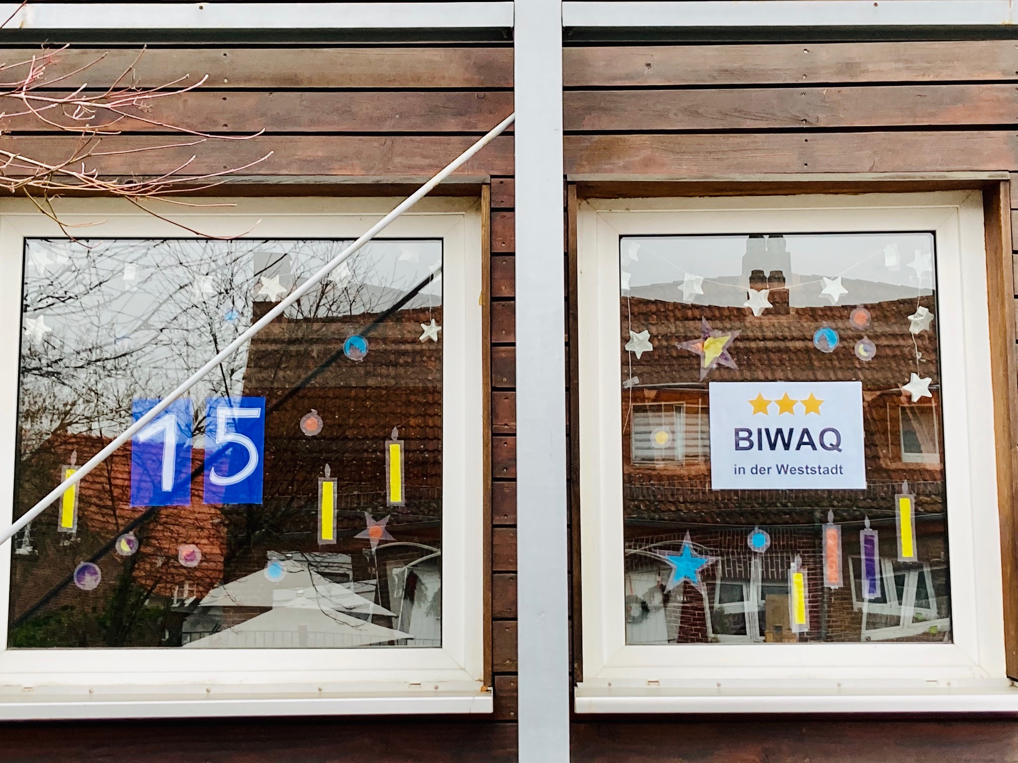 Um die Weihnachtszeit und die Weststadt festlich zu gestalten, hat sich das BIWAQ-Team der Jugendwerkstatt am 15. Dezember 2021 mit einem geschmückten Fenster am Weststadt-Adventskalender beteiligt. Dieser wurde vom Quartiersmanagement des Stadtteilbüros organisiert. Coronabedingt mussten leider der geplante Gedichtvortrag sowie das Waffelessen ausfallen.